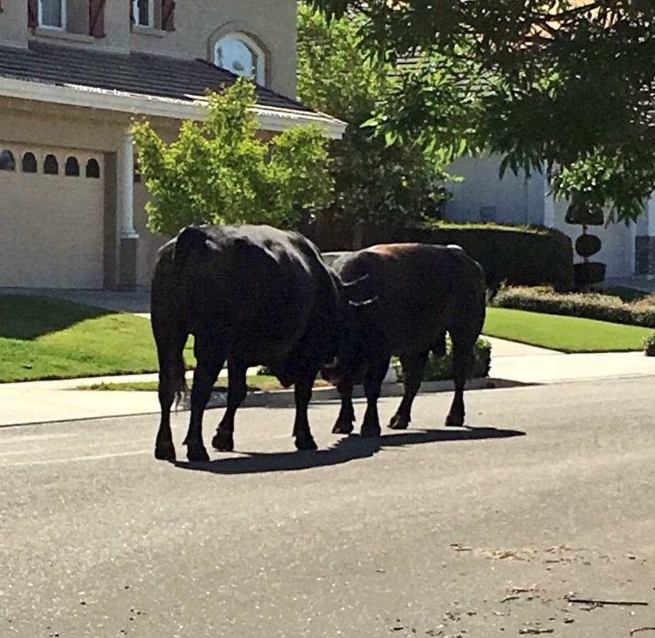 A pair of bulls picked a suburban street in Fremont to settle a score.