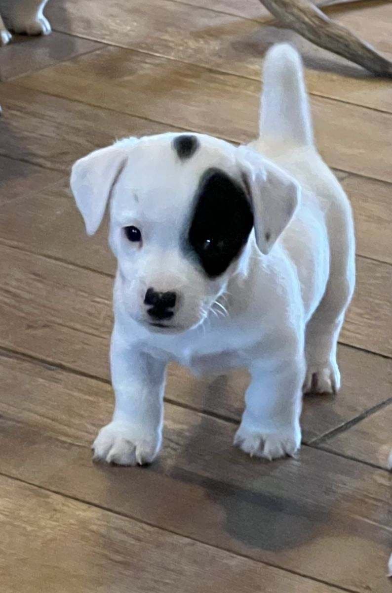 The puppy, named Keo, is described as white with black around the left eye and a black spot on the top of the head.