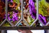 Pintello uses an unexpected technique to create her window paintings. She paints in reverse on the back of glass, etching the smallest details first, then layering in and blending background colors. She does not look at the front of the window until she is finished with a piece.