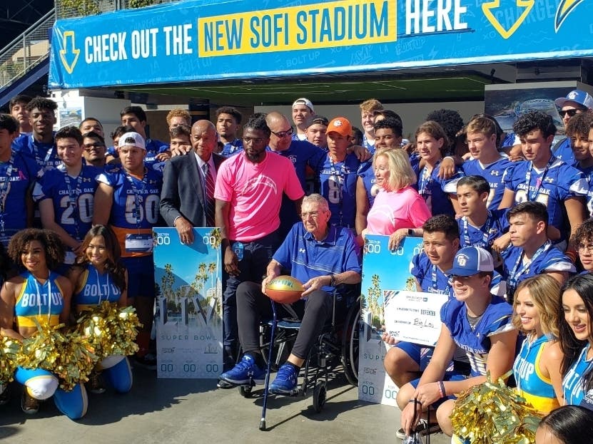 Yesterday, COHS varsity football players and a handful of coaches had the opportunity and honor to participate and serve at the Crucial Catch:” Huddle to intercept Cancer Event” held at the Los Angeles Charger stadium. Our student-athletes volunteered at stations and assisted current and former cancer patients with care packages, food, and activities throughout the day. Our very own Coach “Big Lou” was in attendance and at the end of the event was presented with two Super Bowl tickets from the owner of the Chargers, who is a breast cancer survivor herself. (See below picture) Yesterday was a powerful day for everyone there and we have already received feedback from the NFL, American Cancer Society, and Los Angeles Chargers that they were highly impressed with how our students conducted themselves which is a direct reflection of our Charter Oak family.