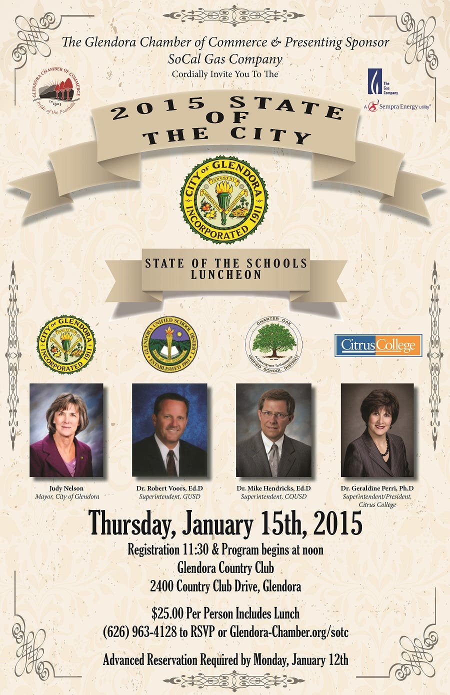 Glendora: 2015 State Of The City & State of the Schools Luncheon set for Thursday, January 15th at 11:30 am at the Glendora Country Club