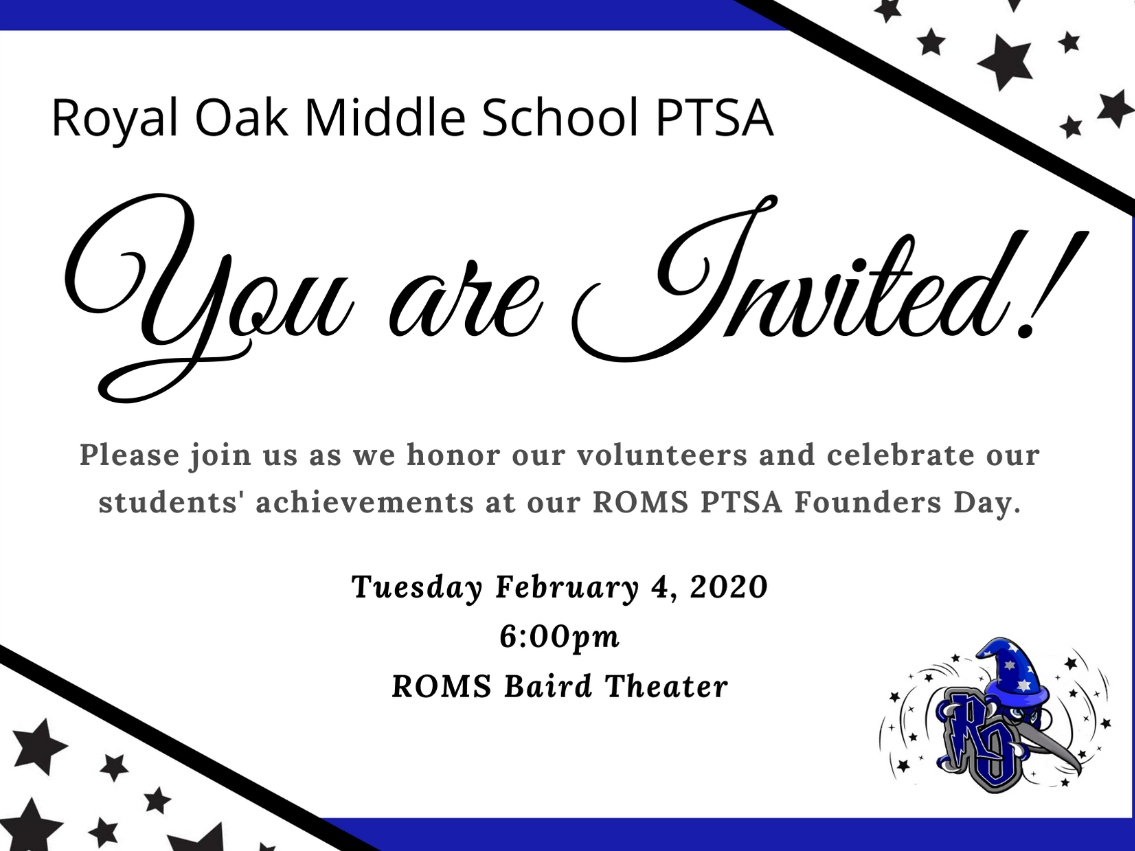 Please join us as we honor our volunteers and celebrate our students' achievements at our Royal Oak Middle School PTSA Founders Day.