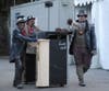 The sheer volume of pieces that make up the sets at the fair is mind-boggling: 40 road boxes (4 ft. tall x 4 ft. wide x 8 ft. long), 90-100 flat "set" kits and two 53-ft. long box vans filled with miscellany too big to be packed anywhere else. When not in use, the materials are stored at Mare Island in Vallejo.