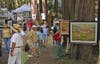 Paintings and photographs are hung on tree trunks or strung up on wire between the redwoods. Folk art, ceramics, glasswork, jewelry, textiles, and sculpture are also displayed, many of the art pieces in tented booths with the redwood forest providing a majestic backdrop.
