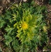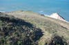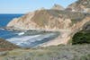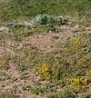 A little over a half mile from the trailhead is another grassy bluff, with two benches offering the opportunity to sit and contemplate a spectacular view of Montara State Beach and the coast beyond. Vegetation around the benches clings to the ground, flattened by both strong winds off the ocean and the trampling of hikers. Despite the severe environment, here again you will find the emerging blooms of footsteps of spring and also the diminutive blossoms of goldfields (Lasthenia californica)—looking as though someone sprinkled the slope with gold.