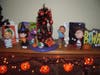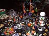 Once you get into decorating with lights, putting them up gets easier from one holiday to the next. We have hooks in the ceiling for our three sets of nightclub-grade black lights, cords with multiple outlets snaking around the yard, and a remote control to get the whole thing up and running with the push of a button. Indoors there are tiny cup hooks concealed everywhere. As quickly as a light string can be uncoiled, it can be hung. When cup hooks aren’t feasible, monofilament is great for invisibly tying lights along anything that will stand still.