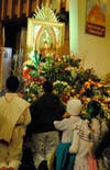 After communion, Flores invited the audience to approach and offer flowers to the Virgin. Over 100 men, women and children of a span of generations lined up down the aisle for the chance to offer their flowers to a portrait of the Virgin. Many kneeled in prayer for several minutes when they finally reached the portrait.