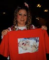 Orozco held up a red t-shirt printed with a photo of a baby that almost looked unrecognizable. She showed an older photo of the baby today that looked considerably better.