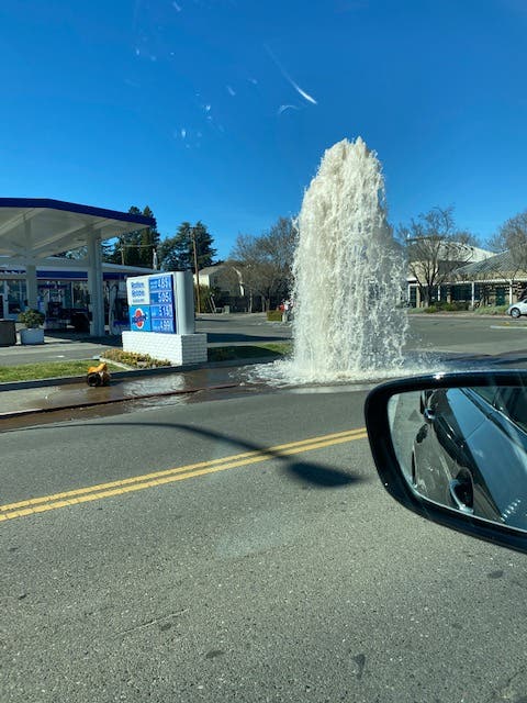 - The fire hydrant in front of the Rotten Robbies gas station on Healdsburg Avenue started shooting a disturbing amount of water into the air early yesterday afternoon, according to a couple different readers who sent me photos. Local real estate pro Stacey Bernd — who, full disclosure, also helps sponsor this newsletter! — said that a big rig truck "took out" the fire hydrant while exiting the gas station. Another local, Phil Workman, reached out to say he spotted the Healdsburg Fire Dept. responding around 1:30 p.m. And Dana Halverson, who works at Rotten Robbies, wrote on Facebook: "That poor guy that ran into the fire hydrant... he felt so embarrassed. Didn't make the wide enough turn... I didn't see it happening as I was helping a customer but I definitely heard the loud bang." She said it took responders "about 20-25 minutes to get the water off." (Inbox & Facebook)