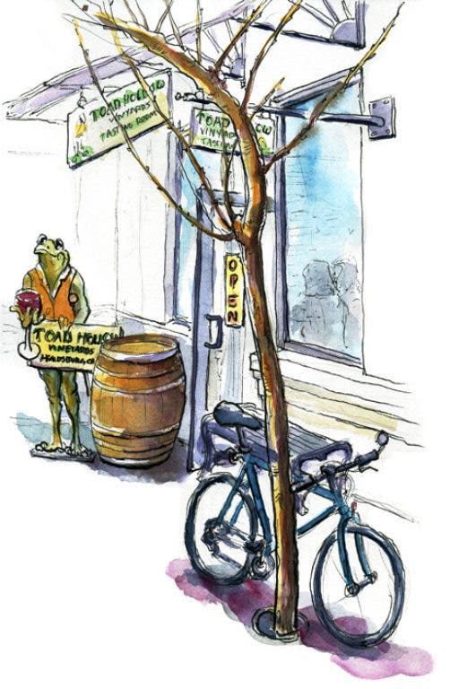At my first stop — — I purchased a tire patch kit, then rode the few blocks to Toad Hollow tasting room, parking against a tree. Standing away from my bike, I thought the view would make a good sketch, and standing as far back as possible on the sidewalk without stepping into the street, I began to draw.