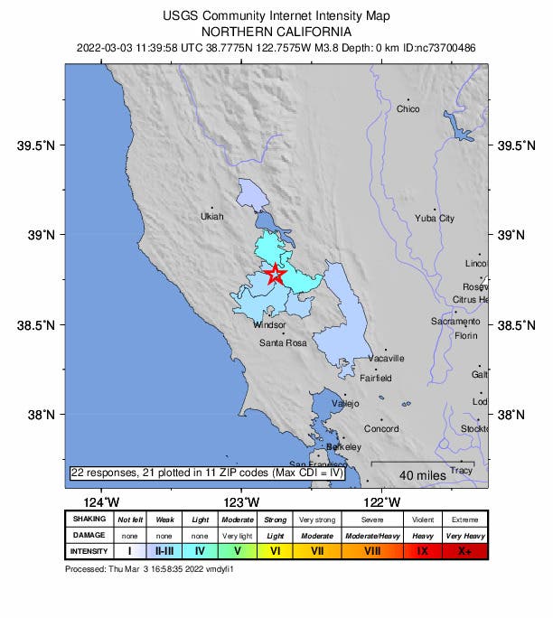 SONOMA COUNTY, CA— A magnitude 3.8 earthquake struck north of Healdsburg at 3:39 a.m. Thursday, according to the United States Geological Survey.