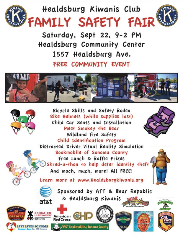 HEALDSBURG, CA – The Kiwanis Club of Healdsburg is hosting a Family Safety Fair on Saturday, Sept. 22 -- a free event to guide residents through planning for such potential disasters as wildfires and earthquakes, along with prepping for possible medical emergencies, learning to use a fire extinguisher and properly install car seats, and more.