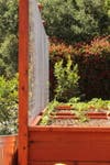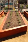 I see the vegetable starts and the beautifully designed new planting boxes. They contain a plethora of vegetable starts—Swiss chard, lettuces, torpedo onions, Padron and banana peppers, tomatoes and sugar snap peas. In addition, at the edges there are blooming strawberry plants and citrus trees.