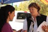 She goes on, “We have a garden, as well, so I’m buying [vegetable] starts.” We stop at Earlybird’s Place and talk to Myrna Fincher to look at the tomato starts. Brown picks cherry tomatoes and says, “Oh, Sun Gold,” as she selects the plants.