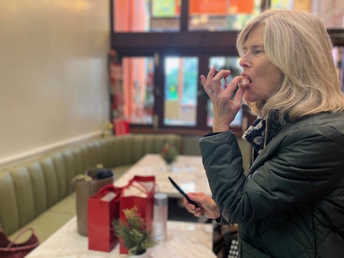 Robin Crowder from Walnut Creek samples a Dutch Door doughnut in Healdsburg, CA.