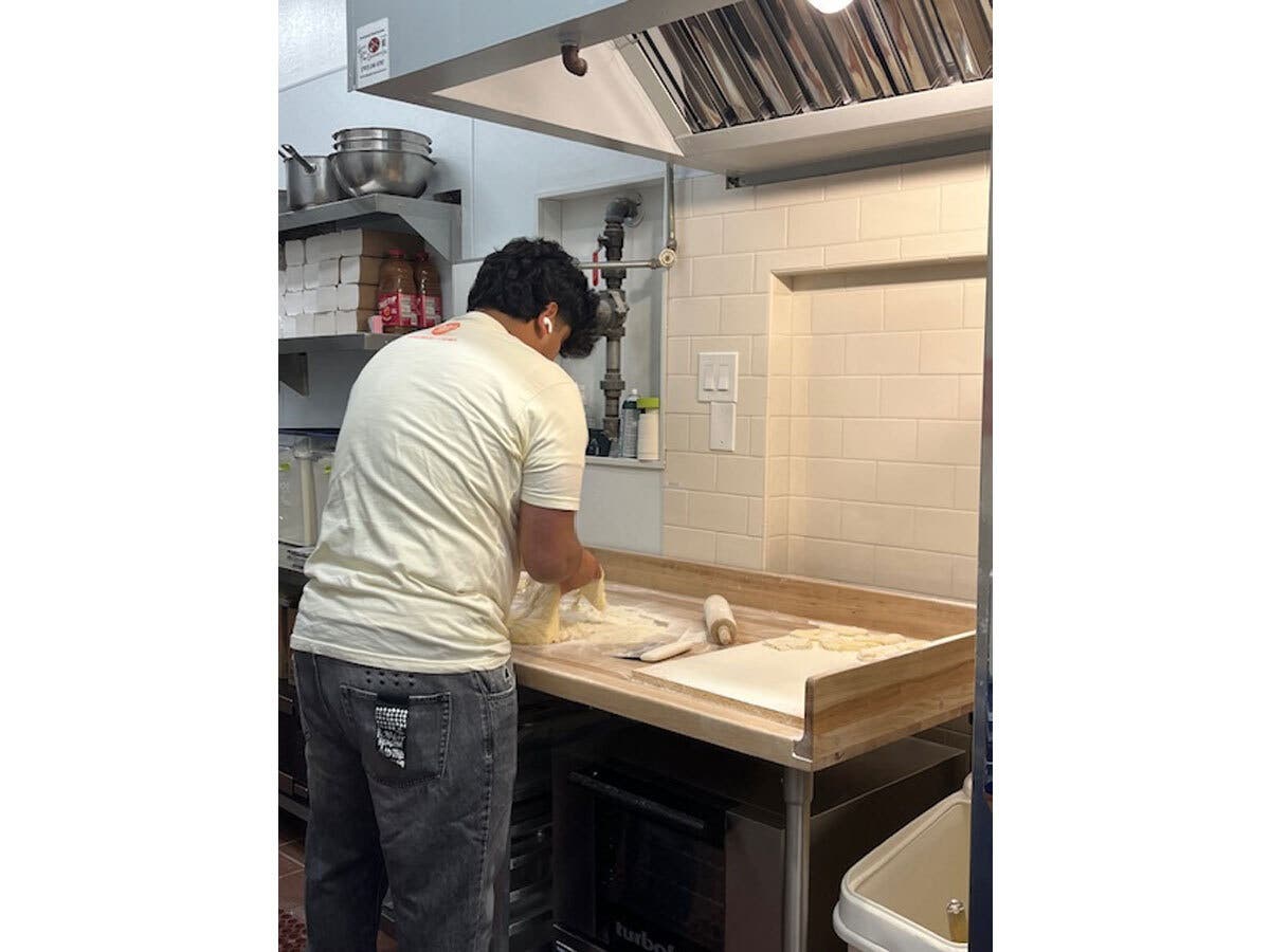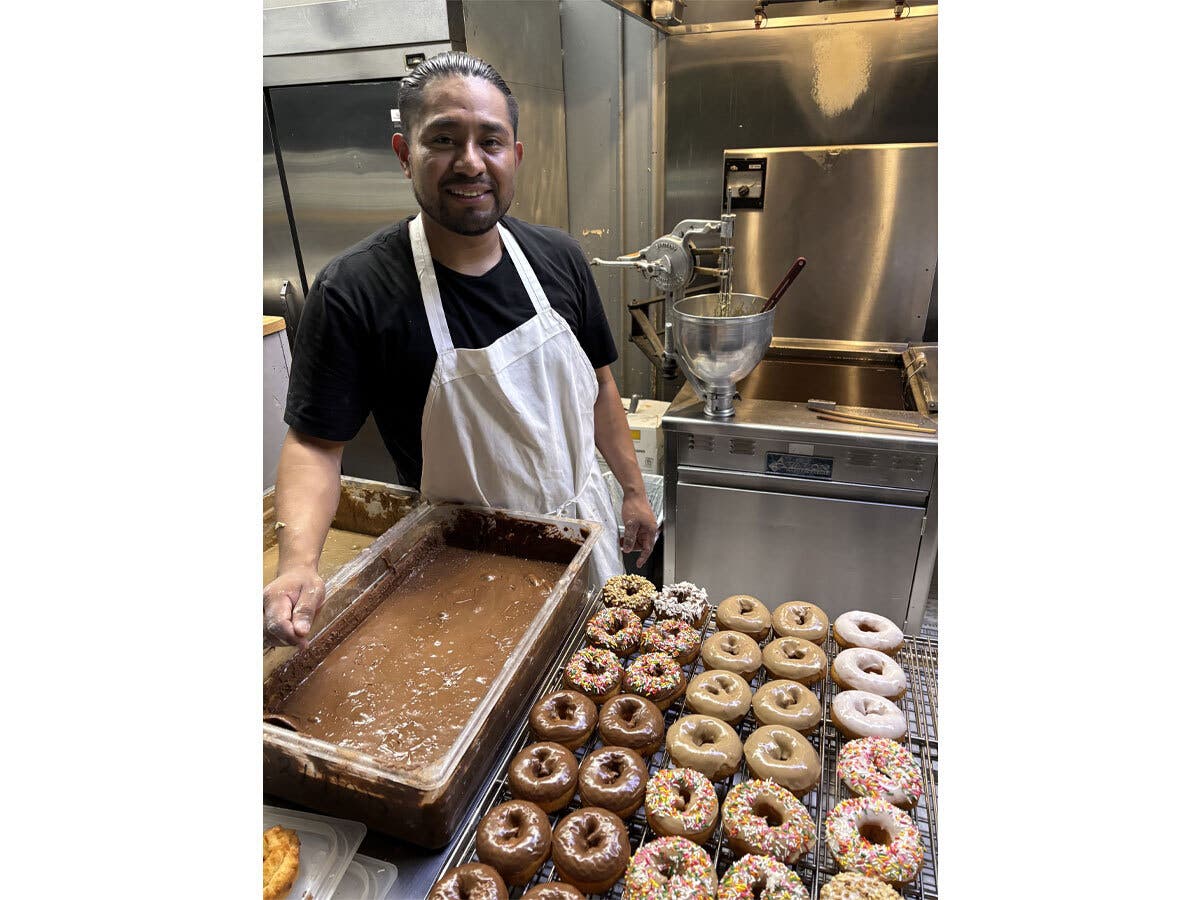 Associates like Eduardo Dolores, above, take orders at the register and frying Dutch Door doughnuts in the Healdsburg shop.