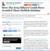 The article, “How The Iran Hikers Could Have Avoided Their Hellish Holiday,” argued that sometimes technical tools such as Google and GPS don’t provide enough information for trip planning. It had been in the works for several weeks when yesterday morning’s news about the release of two American hikers from jail in Iran provided the necessary news hook to get the editor’s attention.