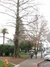 When I heard the news about the Dawn Redwood I hustled the block and a half from the Museum to the Plaza, and spotted the tree right off: it was at the southwest corner entrance, to the right as you walk into the park, behind the young boy holding the flag. It was mid-January, and it was the only redwood standing without any needles.