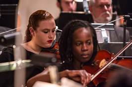 Violists Alexandra Schlosser and Nansamba Ssensalo perform with SONC at Solano Community College in February, 2015. Photo courtesy of Peter Lichty.