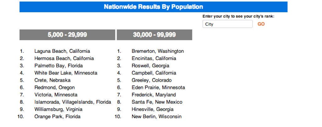 Laguna Beach has taken the lead away from Hermosa Beach for cities with populations ranging from 5,000 to 29,999. The remaining top 10 contenders hail from states other than California.