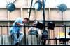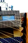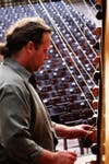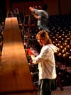 Luke is on top, securing and sending the wire down to Joseph, who walks it through the empty seats to Holly, onstage, who connects it to the resonator. With 24 strings in all, this process takes about an hour. Each string is tightened, and Luke — up on a high ladder above the audience's seats — attaches a wooden block that sets the tone of each string.