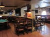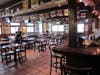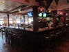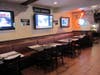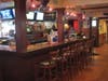 The bar’s interior is reminiscent of the East Coast with its exposed brick walls and chocolate leather booths. Walls are decorated with plasma screen televisions and subway signs. A rich wooden bar sits in the center of the establishment, providing a view of the many sporting events broadcast on various stations. A dining area filled with tables and chairs occupies the main room and a pool table is tucked away in the back.