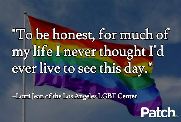 “To be honest, for much of my life I never thought I’d ever live to see this day. But here we are,” said Lorri Jean of the Los Angeles LGBT Center. “For the first time, we have been acknowledged by the nation’s highest court as deserving the rights and privileges of full citizenship, or to paraphrase one of our great founding documents, that we too possess certain unalienable rights, that we too have full claim on the Jeffersonian promise of life, liberty and the pursuit of happiness.”