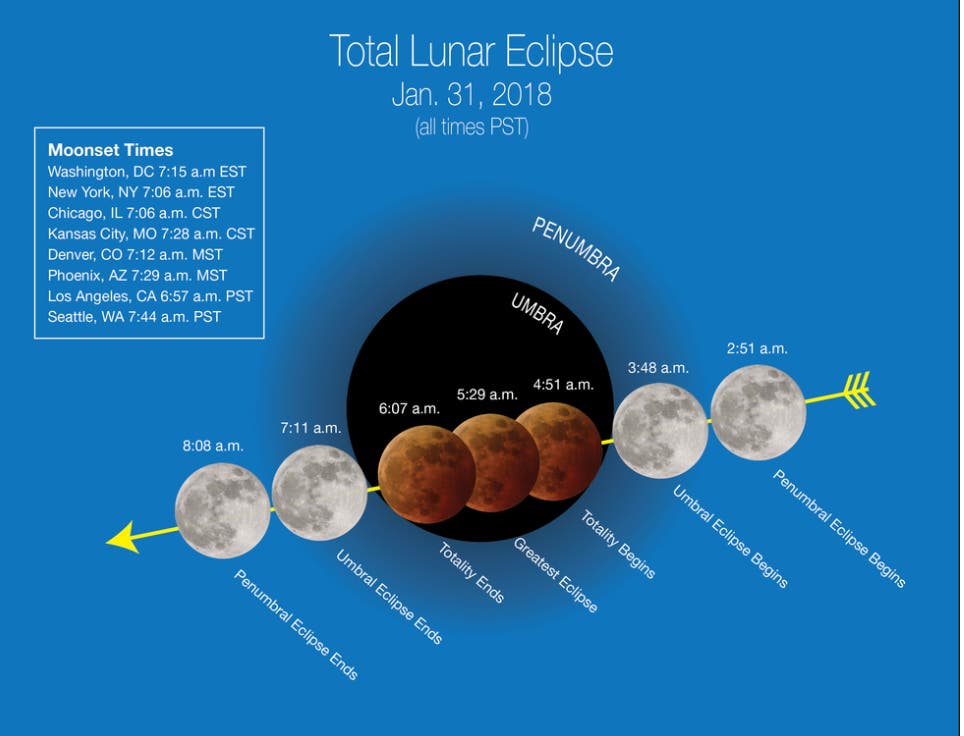 A supermoon occurs when the moon is closest to the earth, making it appear bigger and brighter - 14 percent larger than normal and 30 percent brighter, said NASA officials. A blue moon happens when a second full moon happens in a single calendar month, and this full moon comes out on the last night of January. And a blood moon is the best way to describe the red-tint of the moon created when the earth passes between the moon and the sun. According to NASA, Wednesday morning will be the peak of the Super Blue Blood Moon eclipse.