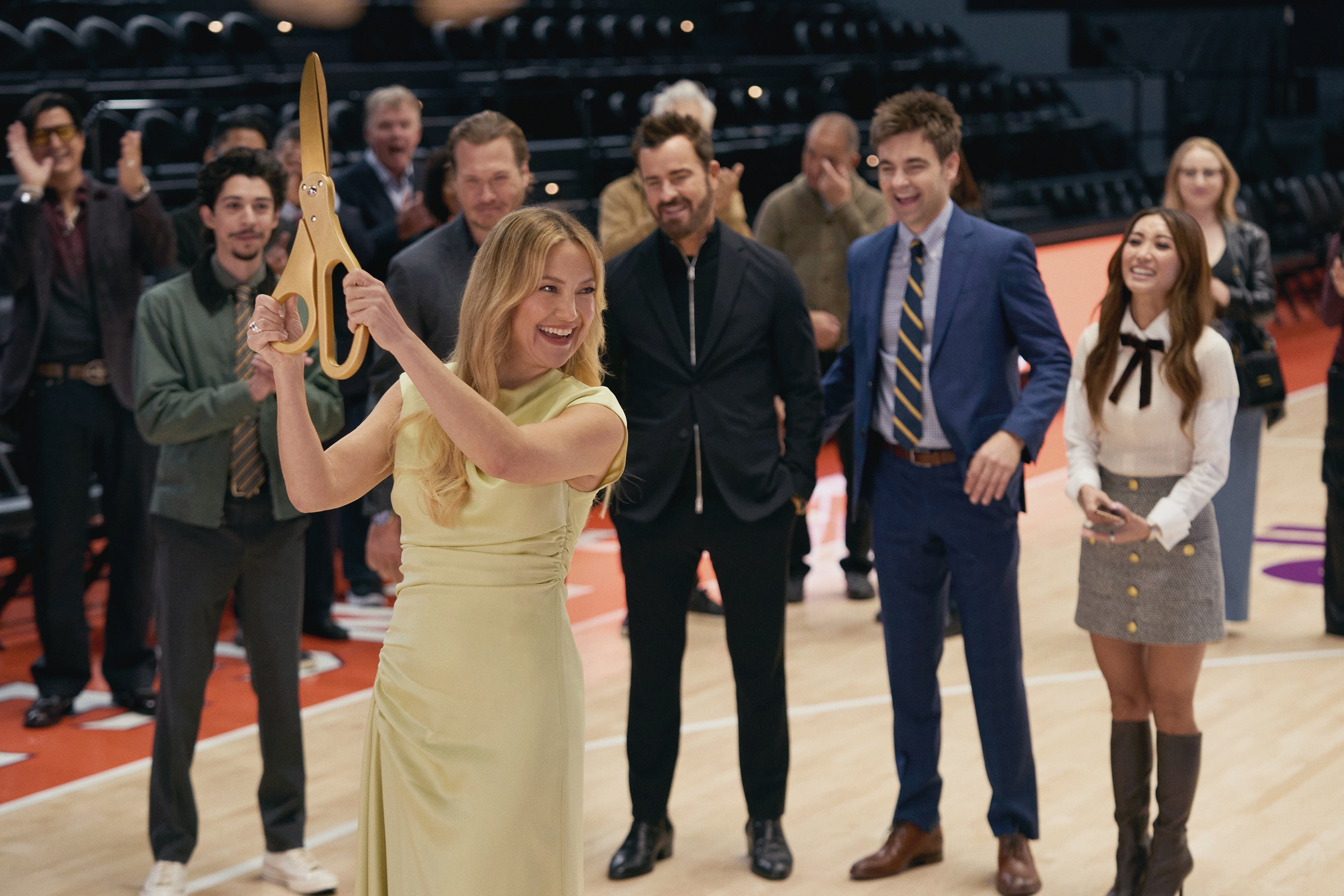 (L to R) Fabrizio Guido as Jackie, Scott MacArthur as Ness Gordon, Kate Hudson as Isla Gordon, Justin Theroux as Cam Gordon, Drew Tarver as Sandy Gordon, and Brenda Song as Ali in "Running Point" Season 2. (Katrina Marcinowski/Netflix © 2025)