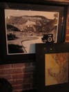 Black and white photos including classic Hollywood scenes of Model T’s parked front of the old Hollywoodland sign, hang on a brick wall, illuminated by spotlights.