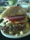 Out of habit, I also ordered a Caesar salad. Very fresh & crisp, the dressing was typical and the combination of the parmesan and black pepper crisps was pleasing. Before I knew it, my main course was in front off my fatt little face. Hand-cut julienne fries, Swiss cheese and béarnaise sauce with fresh crumbled blue chez; what is this? How about adding medium rare sliced N.Y. strips sandwiched on garlic bread? Yes, this is the action! Lettuce and tomatoes with fresh red onions topped it off, but it was the moment where my mouth took that first bite. All of the flavors and the dripping béarnaise and creamy horse radish sauces took this beauty over the top!