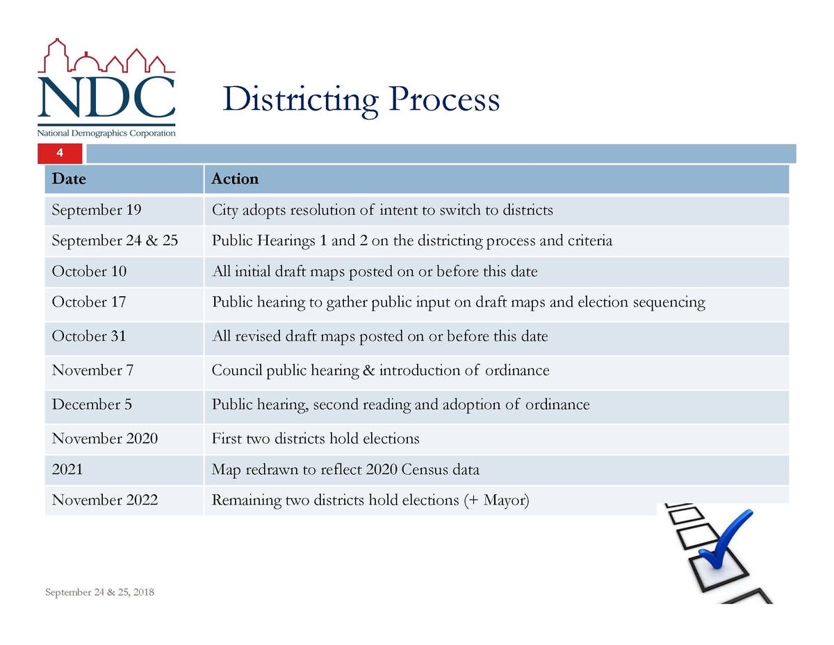 "Latinos are 49% of the total population and 41% of the eligible voters", according to 2010 Decennial Census information provided at Tuesday night's presentation by Justin Levitt of National Demographics Corporation (NDC). Levitt's firm was hired by the city to help with the process.