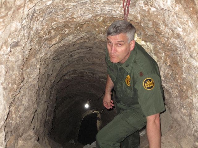 Photo: Former San Diego Chief Patrol Agent Paul Beeson takes a close up look at previously discovered drug tunnel in Otay Mesa. (U.S. Customs and Border Protection)