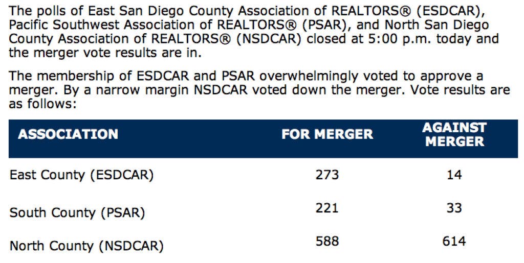 In the end, East San Diego County and the Pacific Southwest Association of Realtors agreed to merge—by votes of 273-14 and 221-33 by the respective groups.