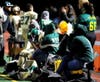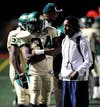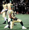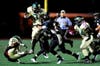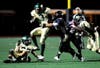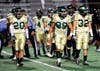 Ledwig was a defensive tackle and Jauregua a wide receiver. Bud Harbin was a halfback in the 1950s, back when football was played in leather helmets.