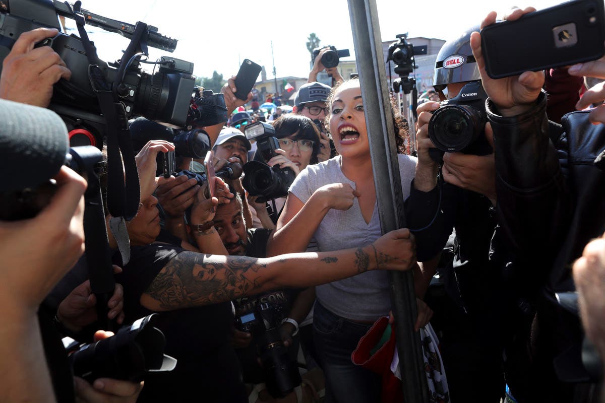 An anti-migrant demonstrator is surrounded by the press as she argues with a woman during a protest against the presence of thousands of Central American migrants in Tijuana, Mexico. (AP Photo/Rodrigo Abd)