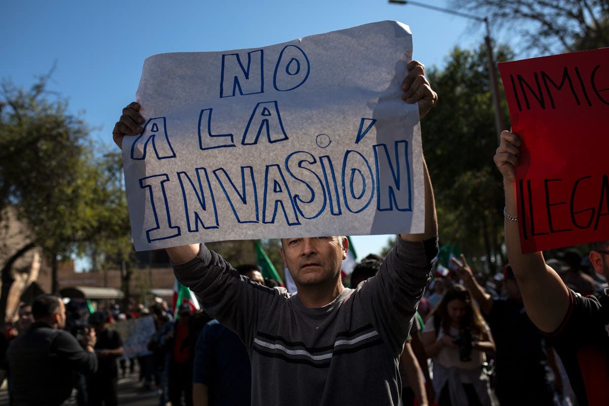 A demonstrator with a sign that reads in Spanish: "No to the invasion" protests the presence of thousands of Central American migrants in Tijuana, Mexico. (AP Photo/Rodrigo Abd)