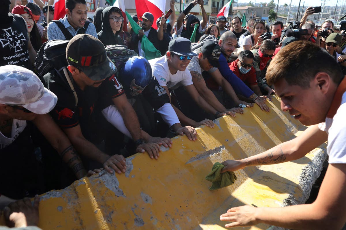 Demonstrators turn over a barrier wall protecting a migrant shelter as they protest the presence of thousands of Central American migrants in Tijuana, Mexico. (AP Photo/Rodrigo Abd)