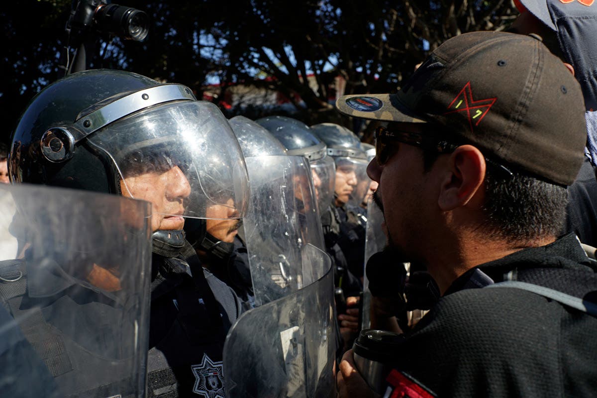 Demonstrators clash with police outside a migrant shelter as they protest the presence of thousands of Central American migrants in Tijuana, Mexico. (AP Photo/Rodrigo Abd)