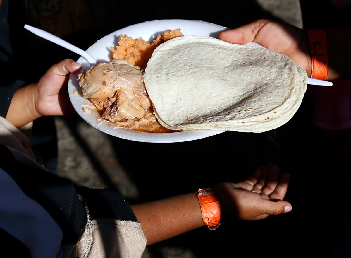 A young Central American migrant receives a free meal of chicken, rice and tortillas at a shelter for migrants in Tijuana. (AP Photo/Marco Ugarte)