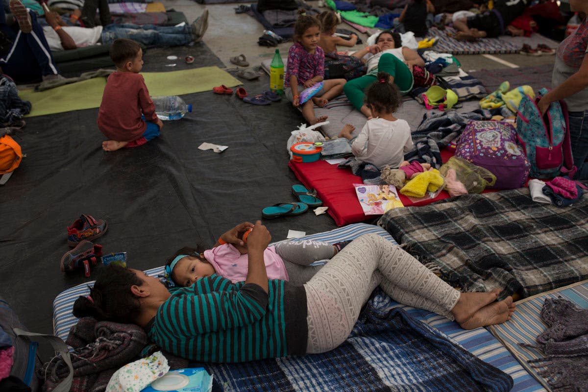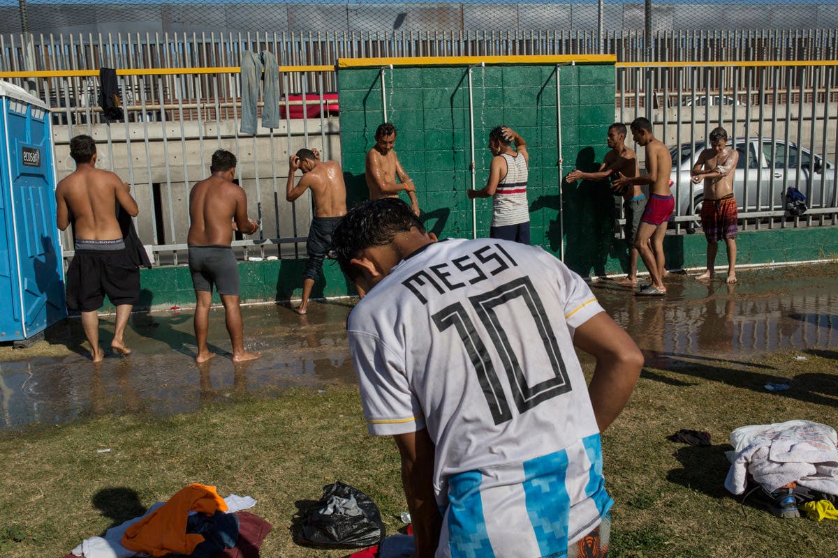 Central American migrants bathe at a temporary shelter in Tijuana, Mexico, early Saturday morning. Many of the nearly 3,000 migrants have reached the border with California. The mayor has called the migrants' arrival an "avalanche" that the city is ill-prepared to handle. (AP Photo/Rodrigo Abd)
