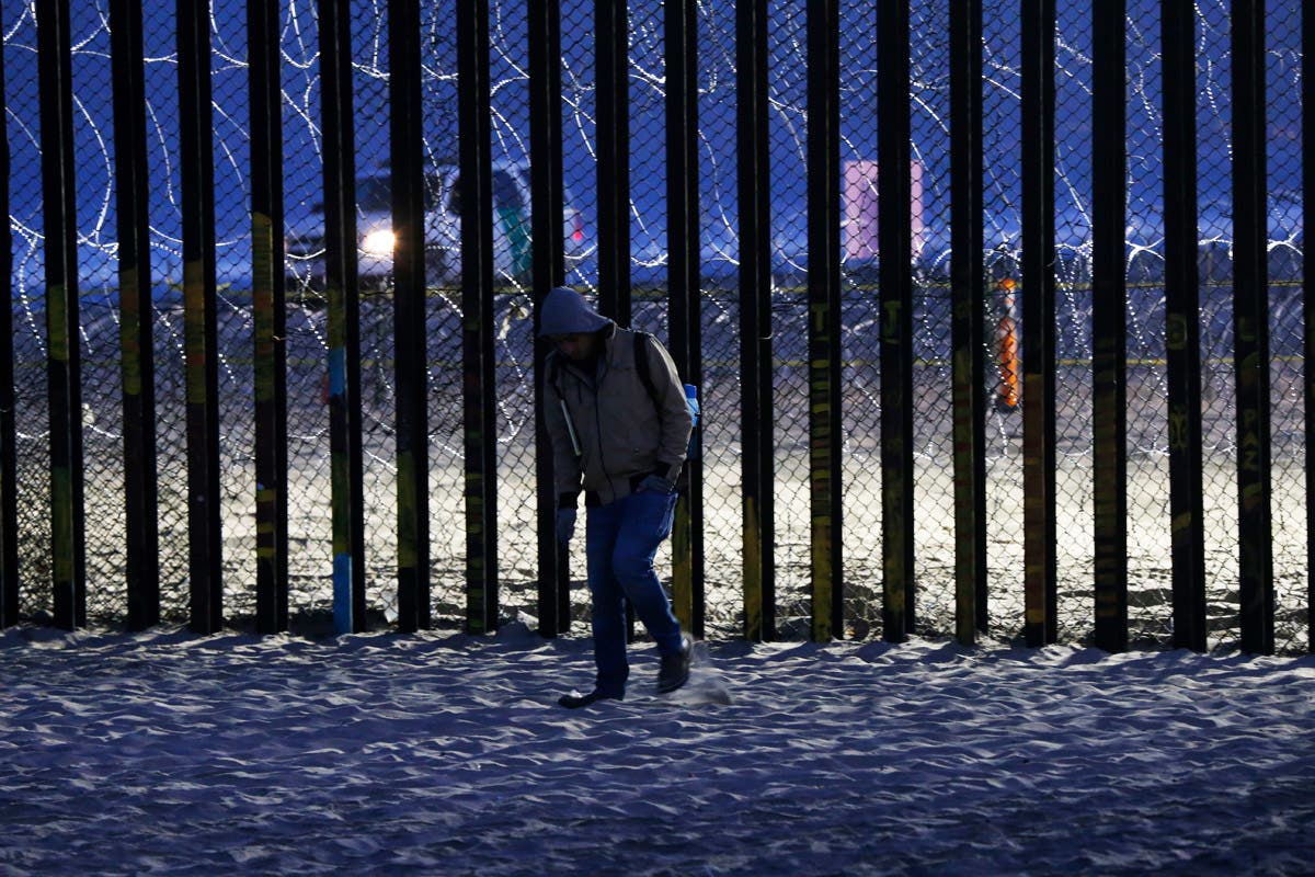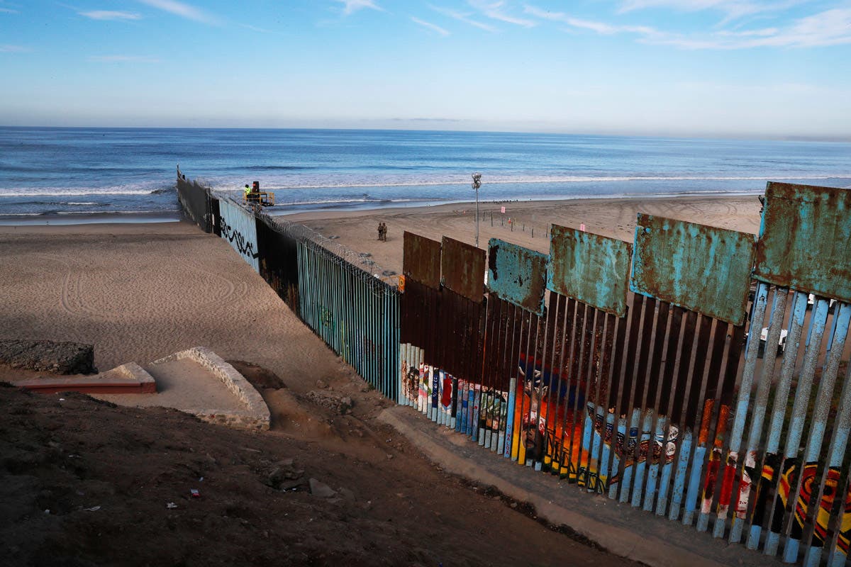 A resident walks near barriers, wrapped in concertina wire, separating Mexico and the United States, where the border meets the Pacific Ocean, in Tijuana, Mexico. (AP Photo/Marco Ugarte)