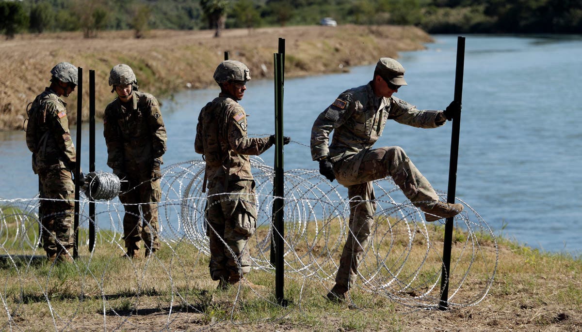 Members of the U.S. military install multiple tiers of concertina wire along the banks of the Rio Grande near the Juarez-Lincoln Bridge at the U.S.-Mexico border in Laredo, Texas. (AP Photo/Eric Gay)