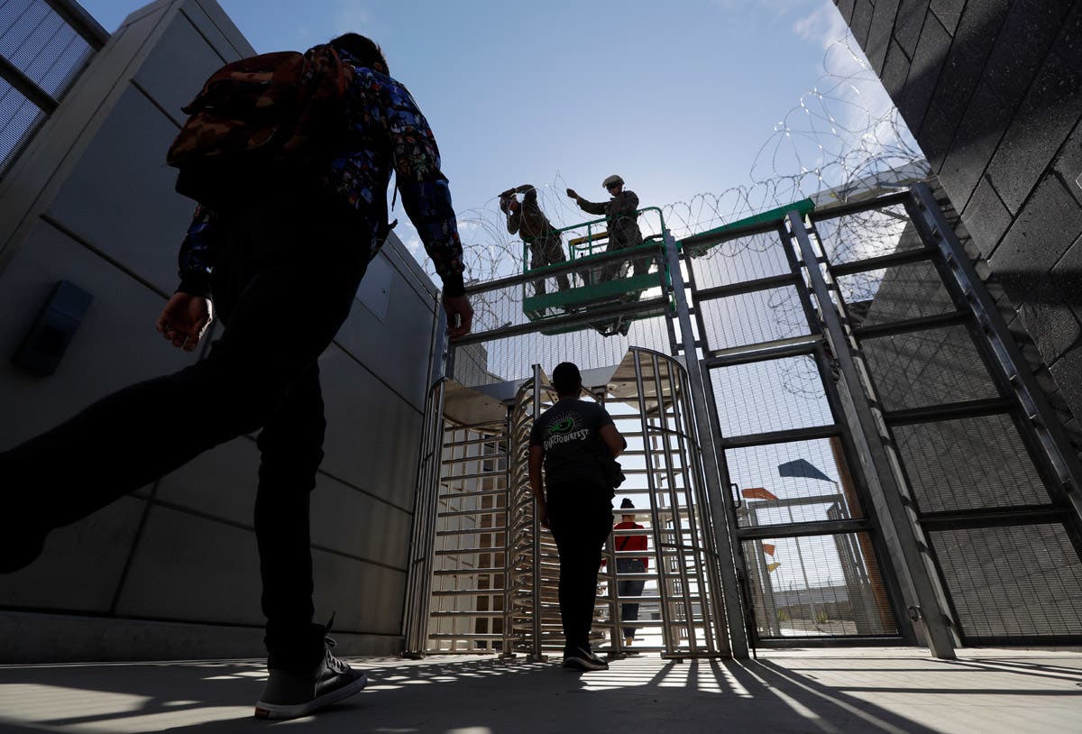 Marines install concertina wire, above, as pedestrians leave the United States for Mexico at the San Ysidro port of entry in San Diego. (AP Photo/Gregory Bull)