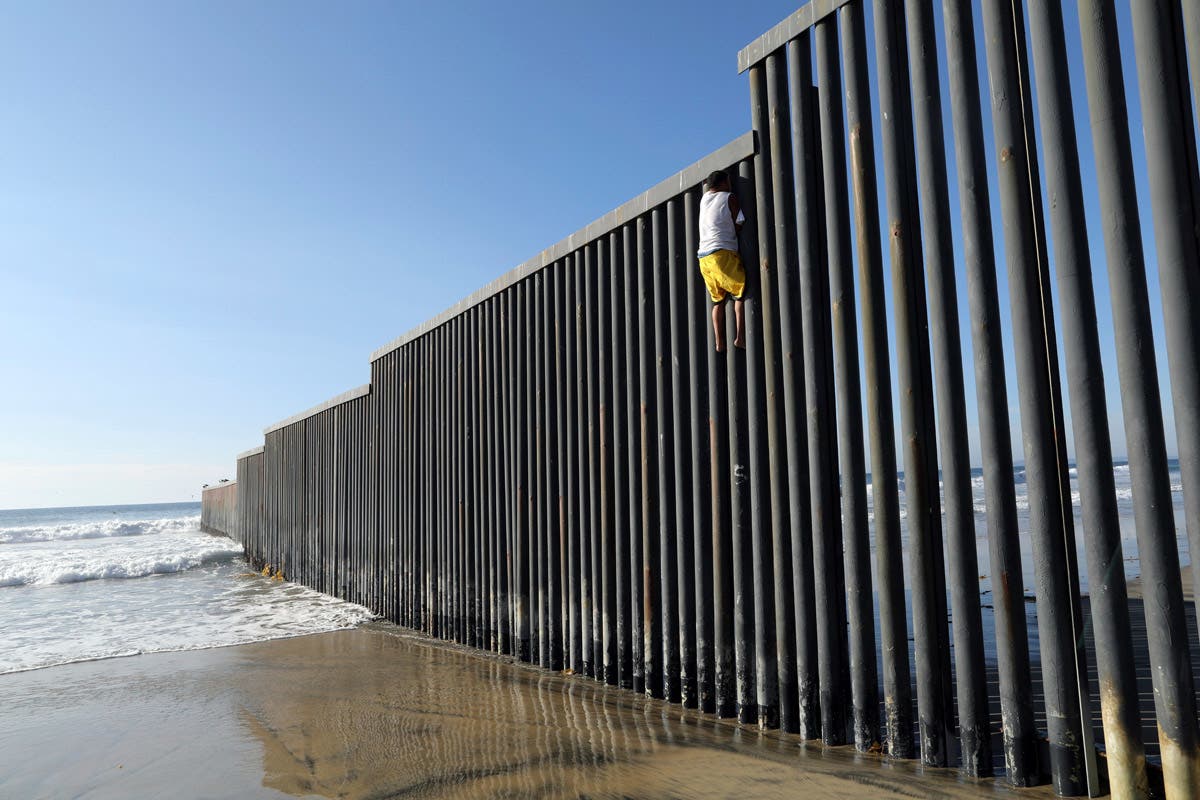 Central American migrant Cristian Andino, 16, from Honduras, gets down from the border structure installed in the Pacific Ocean in Tijuana, Mexico. (AP Photo/Rodrigo Abd)