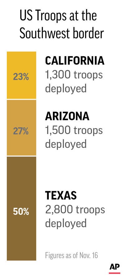 Graphic charts the number of troops deployed by state to the Southwest border. (AP News)