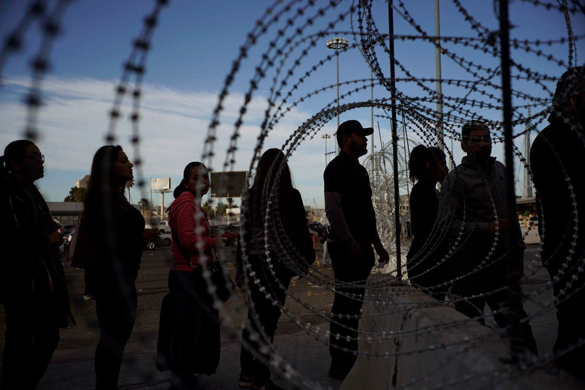 Pedestrians stand near barbed wire at a legal Mexico-U.S. border crossing as they prepare to leave Tijuana, Mexico. (AP Photo/Ramon Espinosa)