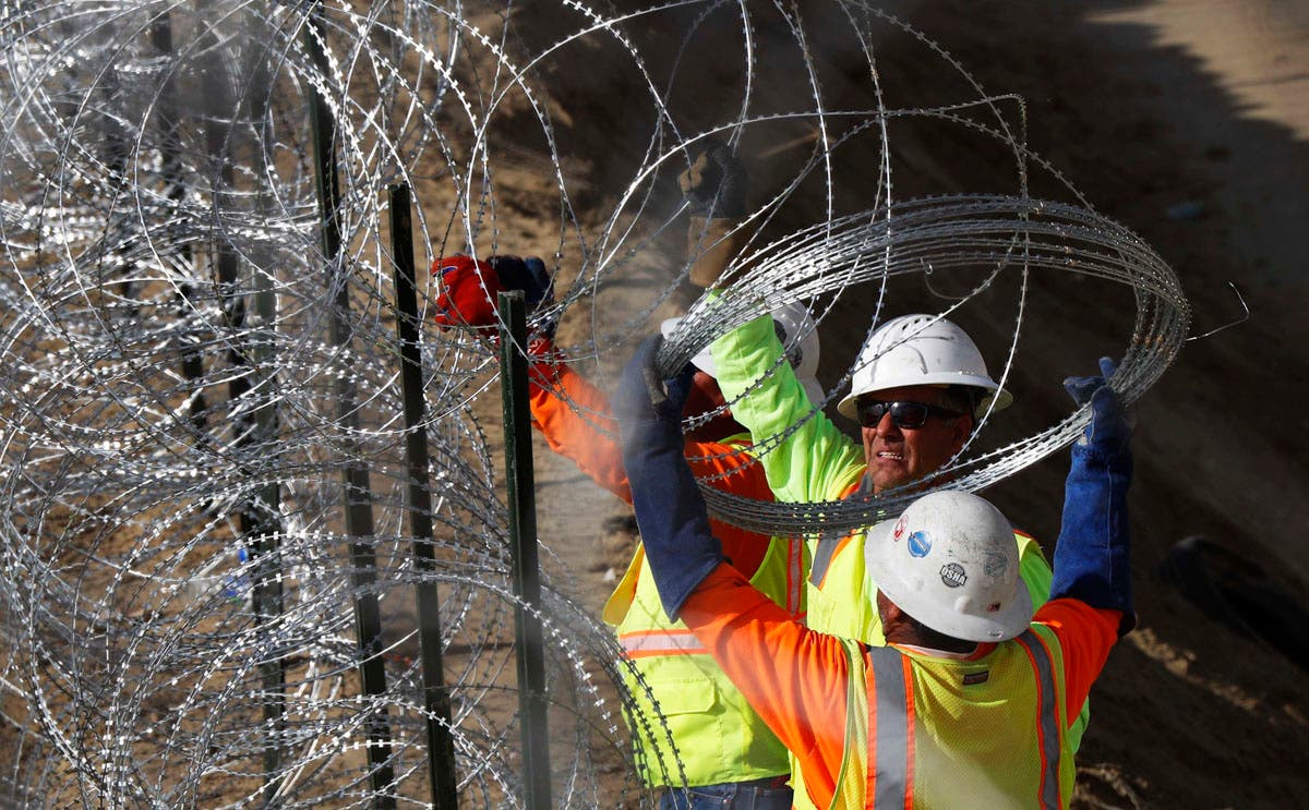 Workers add barbed wire to the U.S. border fence in San Ysidro, California, seen from Tijuana, Mexico, Monday. (AP Photo/Marco Ugarte)