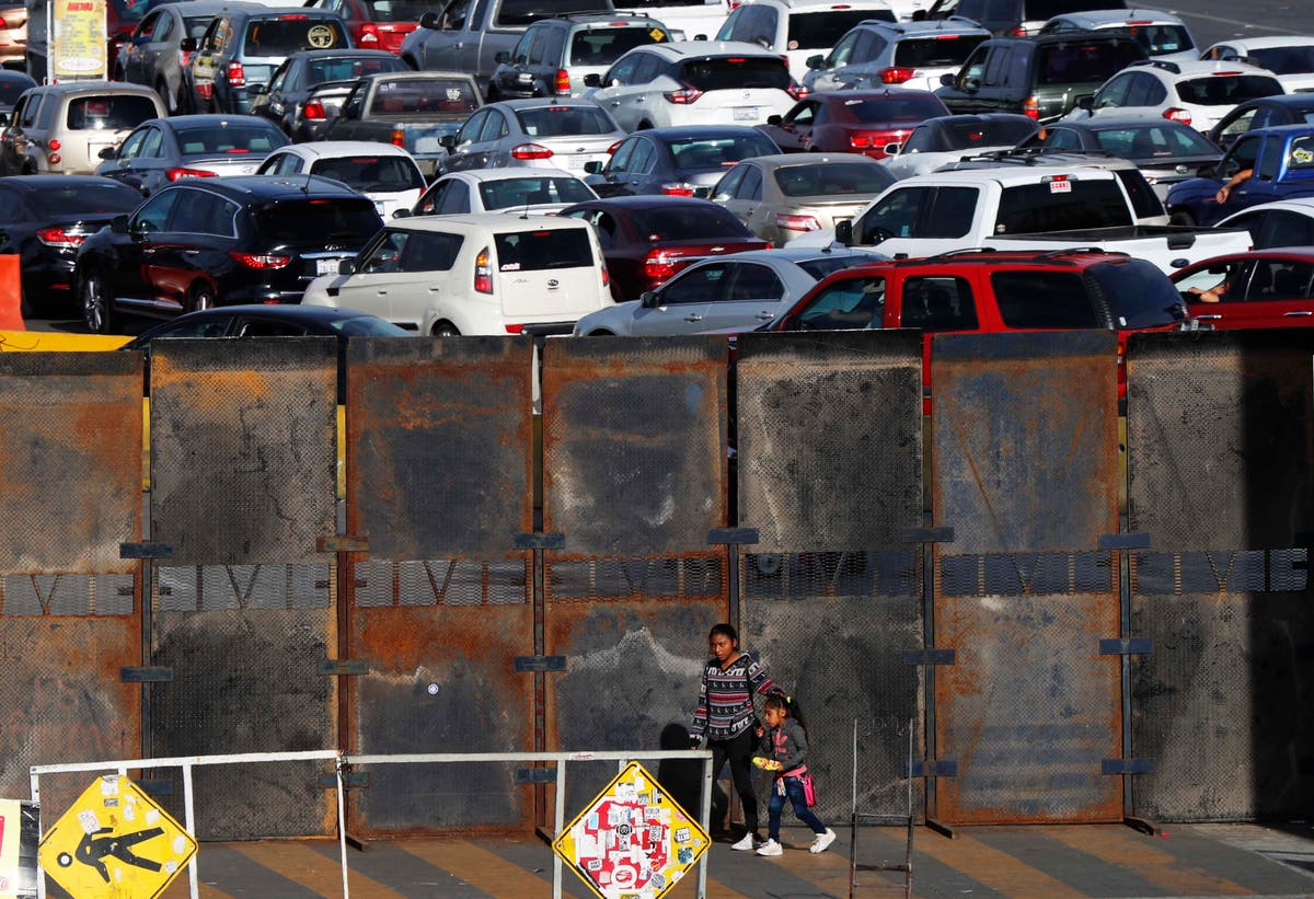 A newly erected barrier wall stands amid cars at the Mexico-U.S. border, as they wait in line to enter the U.S., as they leave Tijuana, Mexico. (AP Photo/Marco Ugarte)