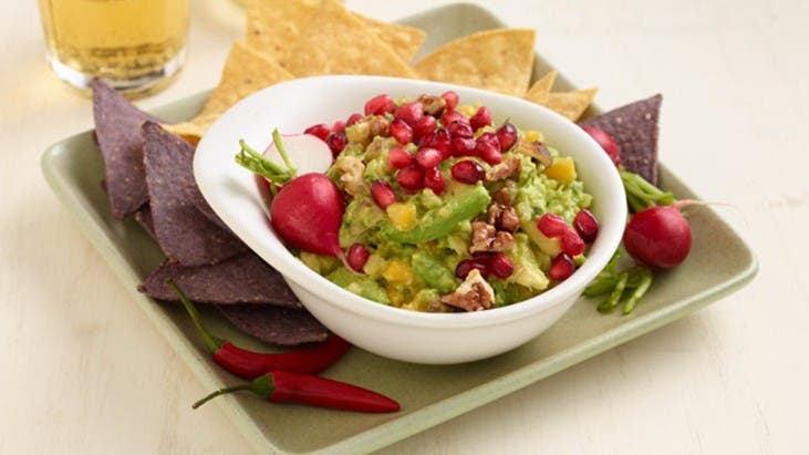 - Garnish guacamole with chile de arbol, candied walnuts, and pomegranate seeds. Serve with chips.